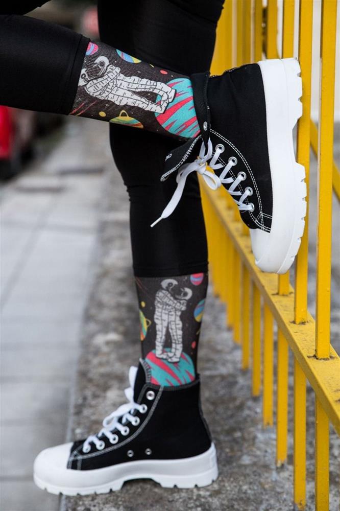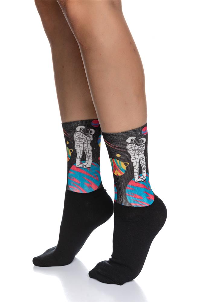 Γυναίκεια βαμβακερή κάλτσα με τύπωμα σχέδιο αστροναύτες αγκαλιά . Εκτύπωση πολύχρωμη,ανεξίτηλη , νέας τεχνολογίας κάλτσες που δεν ξεβάφουν με την χρήση,τον χρόνο και το πλυντήριο ρούχων. Μια λεπτού πάχους κάλτσα. Ενδείκνυται για καθημερινή χρήση. Σύνθεση: 50% Βαμβάκι, 17% Πολυαμίντ, 3% Ελαστάν, 30% Μικροπολυαμίν