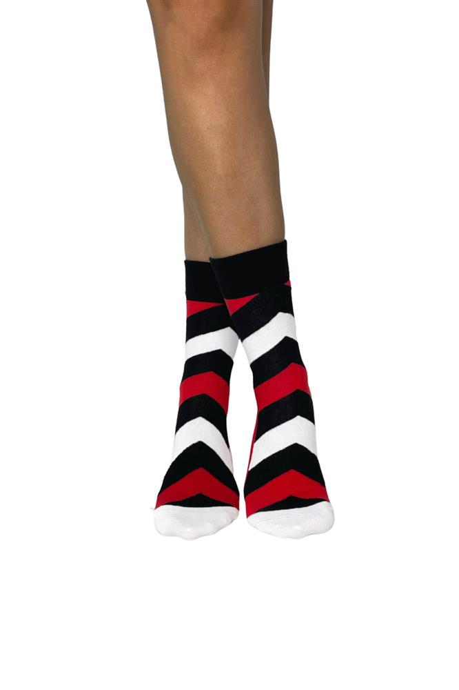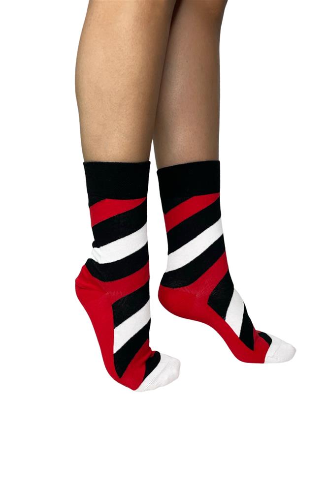Γυναίκεια σκούρο μαύρη βαμβακερή κάλτσα με σχέδιο κόκκινες και λεύκες πλάγιες ρίγες . Η εξαιρετικής ποιότητας βαμβάκι με φαρδύ μαλακό λάστιχο συγκρατεί και δεν ενοχλεί. Ενδείκνυται για καθημερινή χρήση. Ανθεκτική και άνετη.