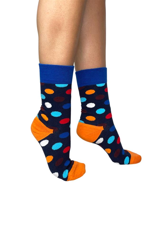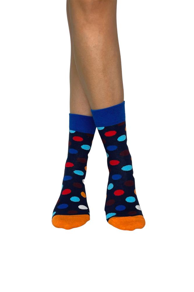 Γυναίκεια μπλε βαμβακερή κάλτσα με τζιν λάστιχο σχέδιο πολύχρωμες βούλες .Η εξαιρετικής ποιότητας βαμβάκι με φαρδύ μαλακό λάστιχο συγκρατεί και δεν ενοχλεί. Ενδείκνυται για καθημερινή χρήση. Ανθεκτική και άνετη.