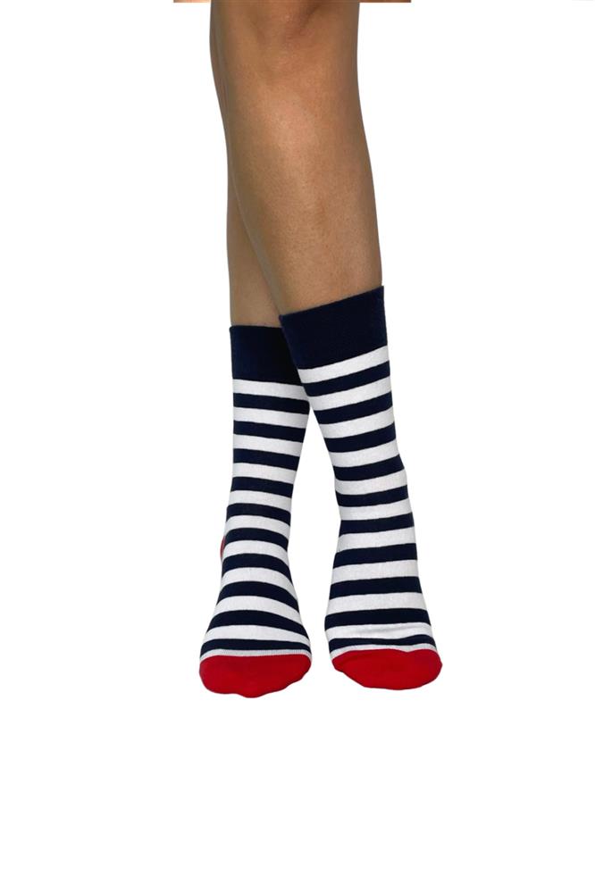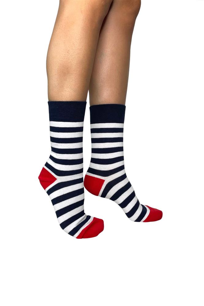 Γυναίκεια σκούρο μπλε βαμβακερή κάλτσα με λευκή ριγα και κόκκινη φτέρνα. Η εξαιρετικής ποιότητας βαμβάκι με φαρδύ μαλακό λάστιχο συγκρατεί και δεν ενοχλεί. Ενδείκνυται για καθημερινή χρήση. Ανθεκτική και άνετη.