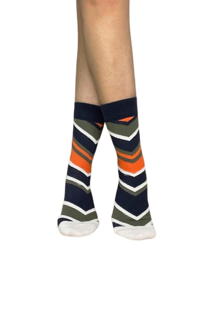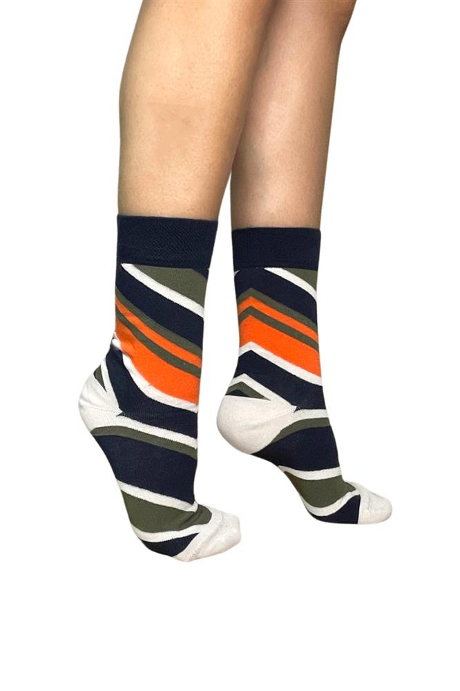 Γυναίκεια μπλε βαμβακερή κάλτσα με χακί,πορτοκάλι και λευκή ριγα. Η εξαιρετικής ποιότητας βαμβάκι με φαρδύ μαλακό λάστιχο συγκρατεί και δεν ενοχλεί. Ενδείκνυται για καθημερινή χρήση. Ανθεκτική και άνετη.