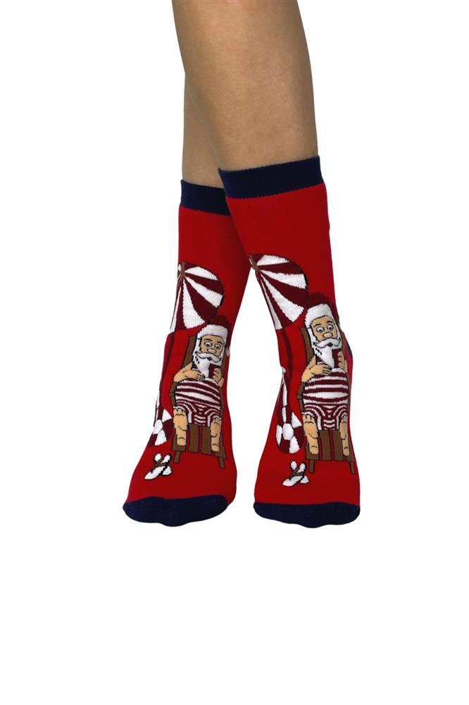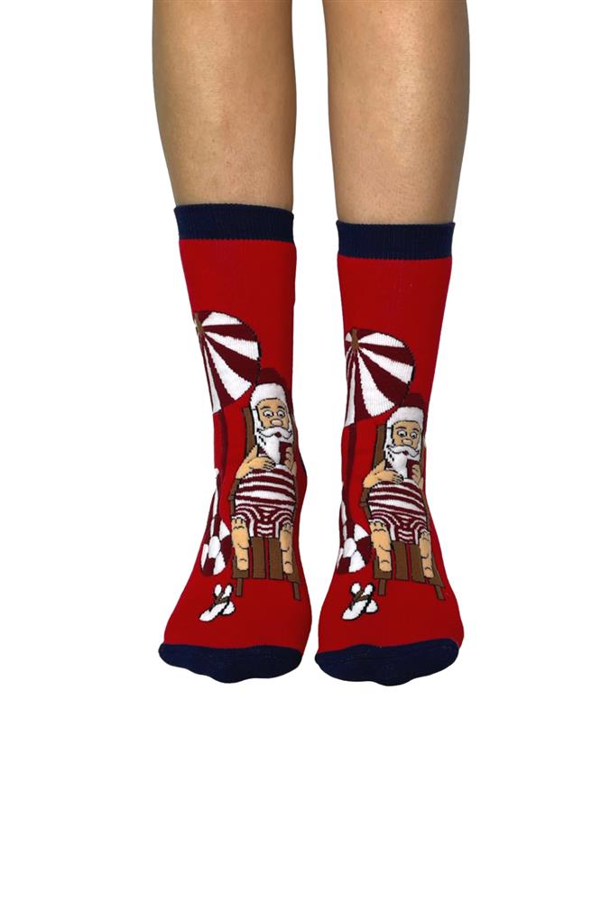 Χριστουγεννιάτικη, βαμβακερή γυναίκεια κάλτσα με εσωτερική επένδυση πετσέτα και σχέδιο Άι Βασίλης στην παράλια . Είναι ζεστές και ευκολοφόρετες, κατασκευάζονται από βαμβακερό μείγμα άριστης ποιότητας, διαθέτουν λάστιχο στο πάνω μέρος και προσφέρουν άψογη εφαρμογή στο πόδι.